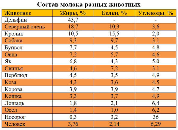 В таблице, приведенной ниже, вы можете посмотреть, как отличается состав молока у разных видов животных. Вы можете увидеть, какие животные дают молоко, более близкое по составу к молоку кормящей женщины.
