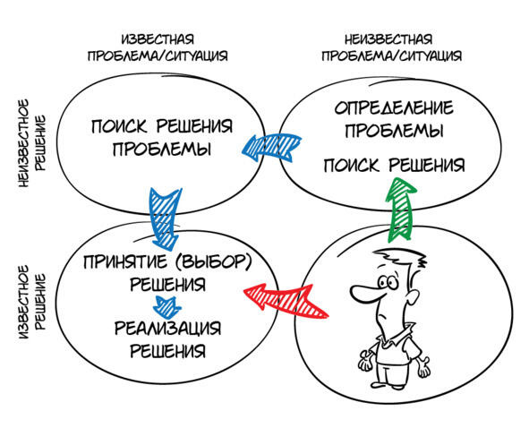 По другой оси разместим степень нашего понимания того, как проблему решить. Внизу будет «известное решение», а вверху «неизвестное решение». Таким образом, у нас получаются четыре квадранта: известная проблема известное решение, известная проблема неизвестное решение, неизвестная проблема неизвестное решение и неизвестная проблема известное решение.