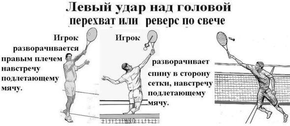 2. Удар «Реверс». Это левый удар над головой по мячу на крутой, уже падающей траектории из высокой левой свечи. В нашей литературе такой удар называют «реверс». На западе применяют термин «левый смэш над головой». Реверс выполняется слева от игрока, в ситуации, когда выполнить какой-либо иной удар невозможно.