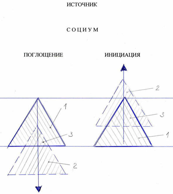 На рис. 1 (слева) пирамида социума перемещается вниз: личности, для которых миссией является решение духовных задач общества (интеллектуалы и другие работники творческого труда), зачастую остаются вне жизненного пространства (зона 1: душевные болезни, наркомания и прочее). Зона 2 определяет тот процесс в социуме, когда недостаток жизненной энергии людей восполняется через потребление спиртных напитков, отражается на здоровье потомства. Зона 3 это «зона жизни» зона жёсткой конкуренции за жизненное пространство, определяемое наличием материальных благ.
