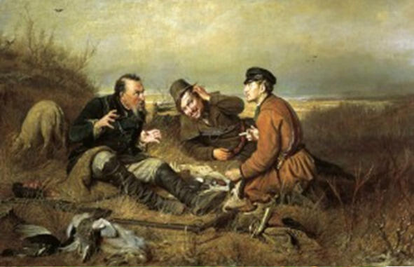 На ней я бы представил три фигуры, определившие историю этого храма. Я расположил бы их, как персонажей картины Перова «Охотники на привале».