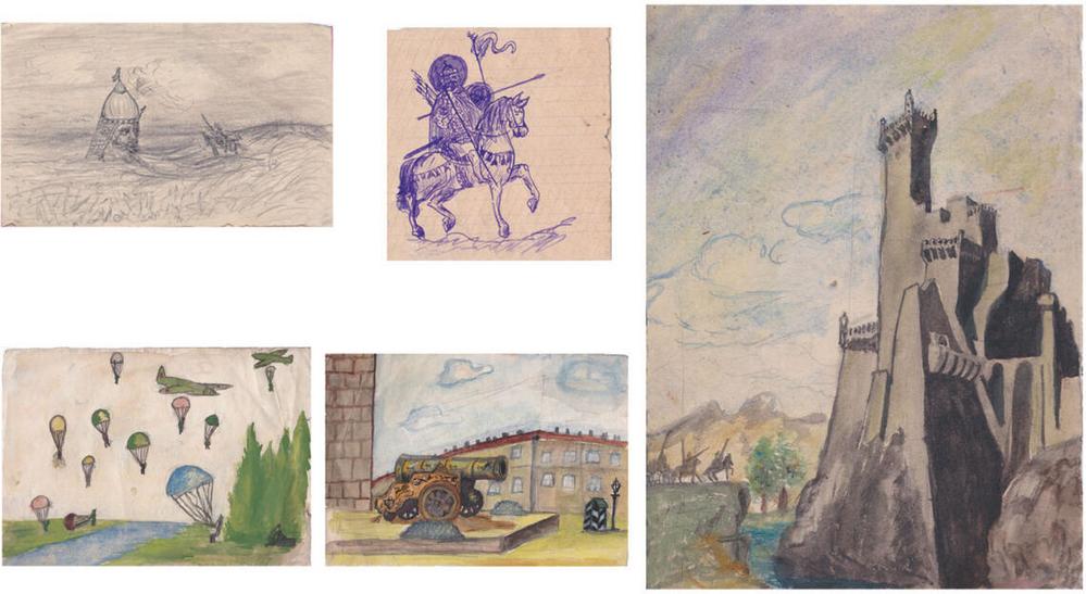 А мать отцу на фронт часто посылала мои художества. Я тогда уже делал рисунки то про Кощея Бессмертного, то про Руслана и Людмилу, изображал, как Руслан на коне остановился на краю пропасти, и плащ у него развевается. А на другой стороне этой пропасти, на неприступной скале стоит замок Кощея Бессмертного. И там разные мечети громоздятся, церкви, ограда, ворота решётчатые, и на цепях подъёмный мост, который опускается и поднимается. И вот Руслан с копьём стоит напротив неприступного замка. На другом рисунке Руслан готовится к бою с Головой, в общем, детские такие сказки.