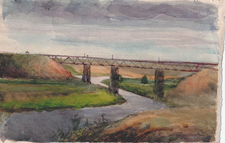 Гена, зачем ты рисуешь это? Я отвечаю: а что? Это же железнодорожный мост, стратегический объект, его нельзя рисовать. Я тогда поворачиваюсь ещё больше и рисую совсем другие силуэты зданий вдали. И снова отец подходит: Гена, ты опять не то рисуешь, это же элеватор, это вообще секретный объект.