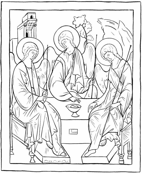 Для Троицкого храма «на похвалу преподобному Сергию» написал Андрей Рублев образ Святой и Живоначальной Троицы. Иконописец изобразил не сам момент явления Троицы Аврааму (Авраама и его жены Сары нет на иконе), но предвечный совет Божественной Троицы, предопределяющий искупительную жертву Христа за грехи человеческие. Два перста Иисуса Христа центральной фигуры Троицы, изображенной в образе Ангела, протянуты к искупительной чаше. Господь дает Свое согласие пойти на Крест и пострадать ради спасения людей.
