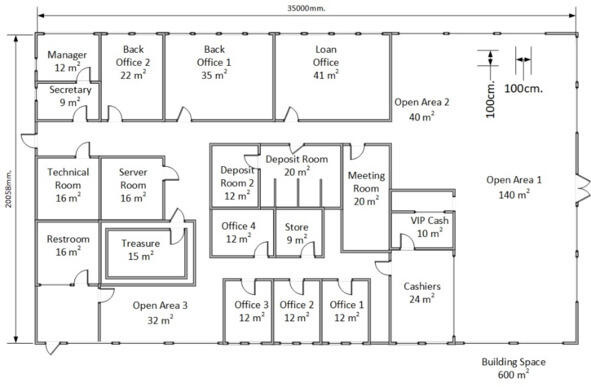 В качестве примера можно рассмотреть план небольшого объекта, филиала банка. На начальном этапе в наличие может быть только общий план помещений.