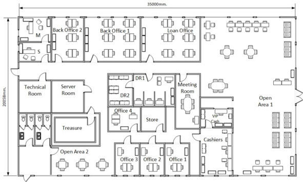 При проектировании объекта, на определённом этапе необходимо наличие дизайнерского плана, который включает в себя размещение мебели, рабочих мест сотрудников и т п. Как пример, на диаграмме показан дизайнерский план филиала банка. На основе данного плана можно уточнить количество рабочих точек и их расположение, направления прокладки кабельных каналов, расположения камер наблюдения и т п.