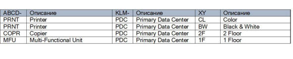 ABCD: определяет тип устройства (например, PRNT, COPR и т п). Может состоять из двух, трех символов.