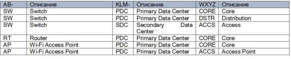 Примеры: SW-PDC-CORE-01, SW-PDC-ACCS-01, AP-PDC-ACCS-01-01