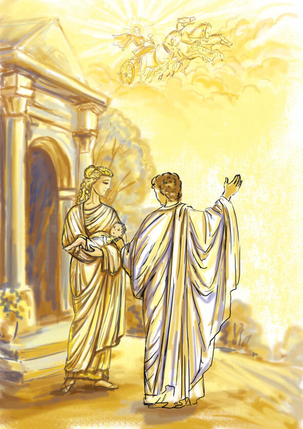 Перед рождением малыша кормилице явился призрак в белом и, улыбаясь, молвил: «Ты выкормишь великое благо для Рима». Та не преминула рассказать об этом будущей матери. Гельвия родила мальчика легко и без страданий. Это был первенец, наследник. Отец был несказанно счастлив. Обнимая жену, он воскликнул: «Клянусь камнем Юпитера, мы дадим сыну достойное образование, и он прославит наш род!». Усталая Гельвия смотрела то на мужа, то на младенца и счастливо улыбалась.