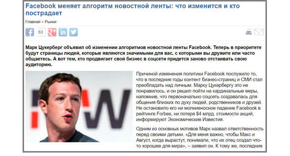 В январе этого года мы услышали, как Цукерберг сказал, что теперь в «Фейсбуке» он будет показывать больше сообщений от друзей, от родственников и, как следствие, компании, которые до этого продвигали свои страницы, вкладывали деньги, будут показываться меньше. То есть вы потратили деньги, можно сказать, наполовину впустую, потому что Цукерберг решил поменять алгоритм новостной ленты.