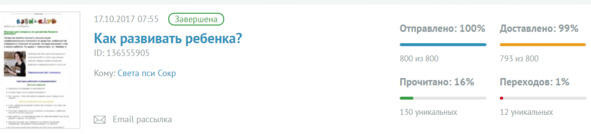 То же и с имейлом. Имейл открывают все меньше и меньше. Приведу реальную картинку 17.10.2017. Нашим детским центром сделана рассылка, отправлена 800 клиентам, прочитали только 130 человек. Всего лишь 16% открыли это сообщение, хотя эти клиенты это не купленная база, это клиенты, которые у нас либо занимаются, либо не так давно занимались.