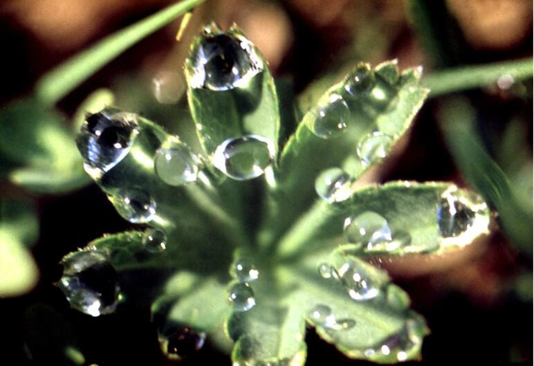 И увидел переплетение гладких светло-зеленых стволов, удлиненных тропических листьев, увешанных десятками голубоватых алмазов. То тут, то там ослепительно вспыхивали радуги. В беспорядочном хаосе желтым уютным островком светилась глянцевитая чашечка лютика. Миниатюрная глазастая мошка соблазнилась уютом, села на лепесток, но, обмочив в кристальной воде свои мохнатые лапки, тотчас взлетела Каждая капля действительно отражала весь мир, но больше всего она отражала солнце и небо. Особенно живописными были те, которые лежали в углублениях листьев, тяжелые, льдисто-объемные, невиданно крупные драгоценности, круглящиеся в зеленоватой оправе.