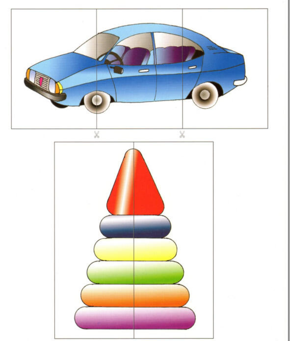 После выполнения задания картинку убирают и предлагают ребенку собрать другую картинку, разрезанную уже на три части.