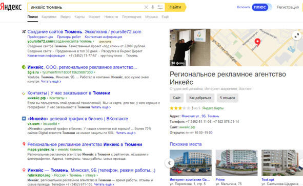 Если по названию компании или по бренду вообще не находит вашу компанию, а находит компании из других регионов, то необходимо в поиск вбить бренд + город. Например, я вбиваю «Инкейс Тюмень». Если у вас филиал или франшиза, то такая ситуация стандартна, что по названию бренда без указания города выдает другие филиалы и головной офис. Чтобы такого не было, вам тем более нужно самостоятельно после изучения этой книги заняться своим брендом в интернете.