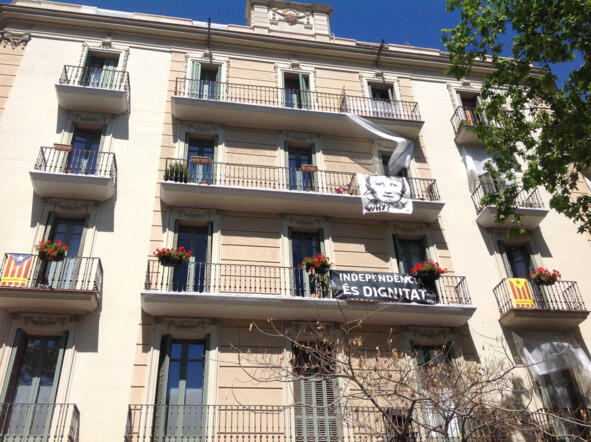 Политические лозунги и флаги Каталонии на балконах жилого дома в Барселоне