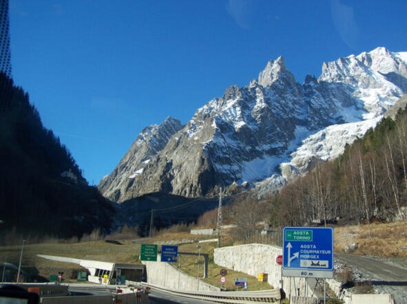 После проезда по высоченным эстакадам, уходим всё выше и выше по серпантину к тоннелю Mont-Blanc. Его длина 11,6 км. Условия проезда по тоннелю даны тоже ранее. Напомню об оплате: по сравнению с 2011 годом подорожало и сейчас стоимость составляет 43,50 . На обратном пути, при предъявлении сохранённого чека, предоставляется колоссальная скидка, и к оплате менее 25% от первоначальной стоимости.Traforo del Monte Bianco название тоннеля на итальянском языке. Тоннель проехали за 11 минут. И мы в Италии! Ищем место парковки для обзора горных видов.