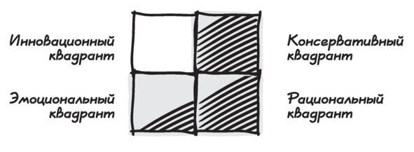 Компания с большой долей клиентов-«приверженцев» для представителей других групп клиентов это Консервативно-Рациональная компания. В ней очень слабо задействована Эмоциональная область. Инновационная область не задействована вообще.