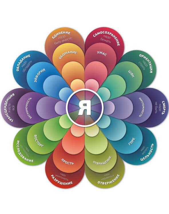 Базовых стратегий имеется десять. Восемь из теории Плутчика: самосохранение, разрушение, единение, отвращение, обладание, цельность, ориентация, исследование. Их я частично переименовал, чтобы было понятно, как они проявляются в жизни. Плюс есть две «системных», добавленных мной: трансценденция и смерть.