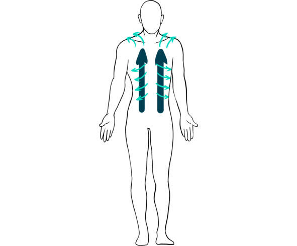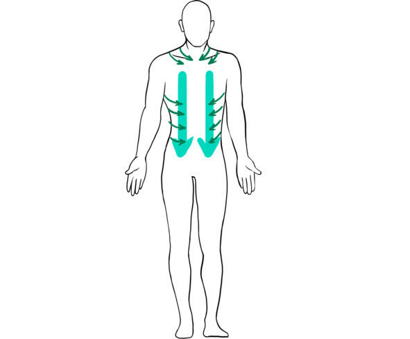 5. Теперь просим человека лечь на спину, и делаем симметричные движения обеими руками по направлению от боков туловища к середине. Обратите внимание, что движения руками заканчиваются примерно там, куда доходят стрелки на иллюстрациях. Обрабатываемые нервные каналы не простираются через грудь или подбрюшье, поэтому поглаживание там не делается. Начинаем движения с верхней части туловища, постепенно продвигаясь вниз. Три прохода.
