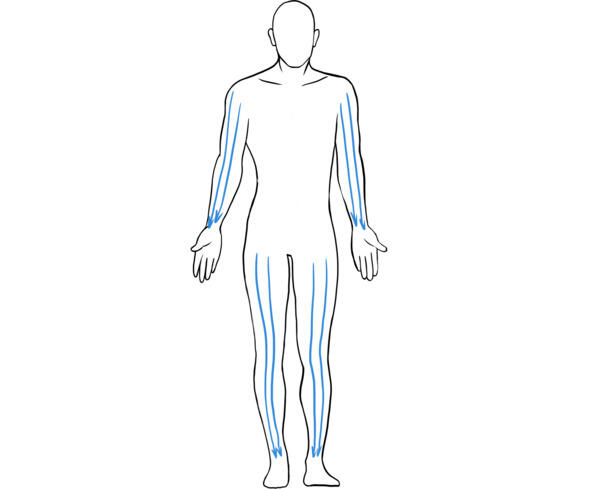 7. Приступаем к конечностям. Все так же расставляем пальцы веером, как бы обхватывая руками каждую конечность, и проводим сверху вниз три раза сначала по каждой руке, затем по каждой ноге: 1-2-3-4.