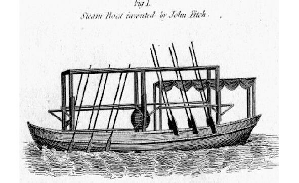 Первое паровое судно, построенное в конце XVIII века американским изобретателем Джоном Фитчем (John Fitch), приводилось в движение веслами. Гребцы были заменены паровым двигателем, в остальном старый принцип действия корабля не изменился (рис. 1.4). А главное, что движители (весла) были оставлены от старого судна.