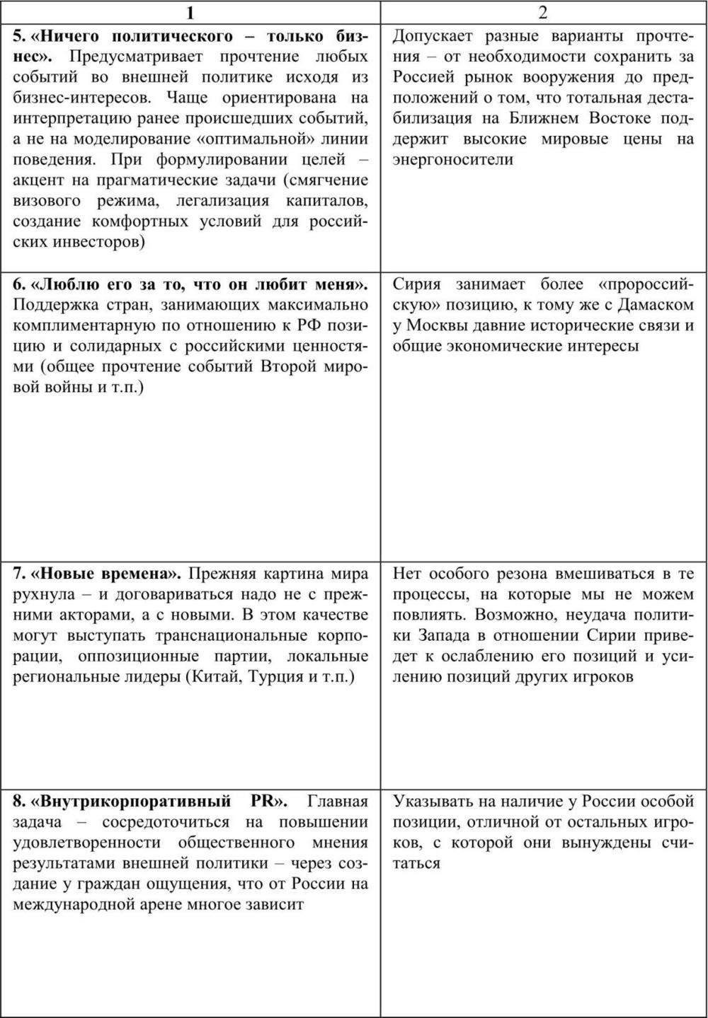 За пределами таблицы осталось множество резонансных точек зрения, которые хотя и присутствуют в медиаполе, но заметного распространения не получают. В их числе поддержка «русского мира», однозначная солидаризация с одним из ключевых игроков мировой политики (Запад, Китай, исламский мир), представление о нецелесообразности расходования ресурсов на международные проекты, ставка на взаимодействие с передовыми странами для доступа к технологиям и инновациям и т.п. В чистом виде такие концепции весьма редко встречаются среди элит, а в отдельных случаях воспринимаются как утопические (например, проекты В. Якунина по усилению акцента на православной тематике в международных отношениях).