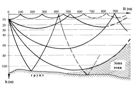Рис. 1. Траектории звуковых лучей при отрицательной рефракции в глубоком море.
