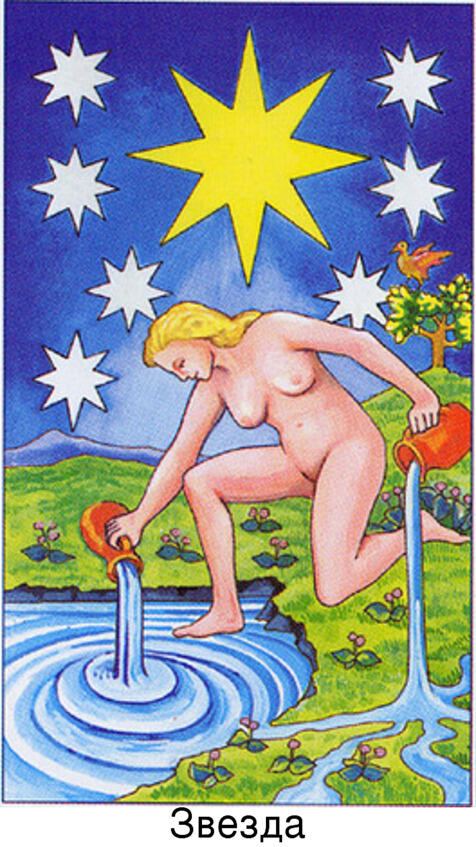 Вспомните русские народные сказки там героини всегда с длинными косами; на Руси так было принято, если женщина сильная, со статусом. И шампуней таких хороших не было, как сейчас, тем не менее, они носили длинные волосы. На нашей карте также не нарисовано, что у нее «во лбу звезда горит». Вообще-то правильно, должна быть. Пушкин так и написал: «Месяц под косой блестит, а во лбу звезда горит», это значит, что у нее, как минимум, хорошо наработаны волевые качества. Представьте, она прекрасно понимает, что ее работа бесполезна. Она видит, что из левого кувшина вода выливается назад, но она не останавливается, работает не покладая рук.