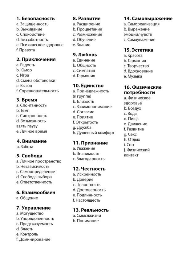 1. Ознакомьтесь со списком потребностей. Убедитесь, что потребности вам знакомы и понятны. Если что-то остается непонятным, можно сверится со словарем или пропустить сомнительный пункт.