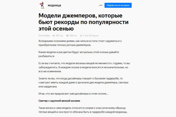 Каналов в стиле «где купить ведро дешевого косметоса с бешеной скидкой и не облезть после его применения» пруд пруди. Но нет никого, кто рассказал бы о разумном люксе, например. По крайней мере, за три года редактуры Дзена мне такие не встречались. Навалом каналов о том, где сэкономить, и ни одного о том, где заработать. Я имею в виду продуманные, серьезные и законные способы, а не хайп и прочие околокриптовалютные кэшберри-лохотроны. Мало качественных обзорщиков. Мало интересных рассказчиков историй. Кто уже понял, что делать с этим абзацем, молодчаги!