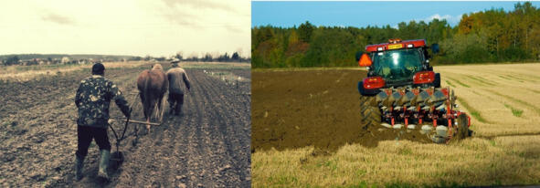 Рис. 4. Лошадь тянет один плуг, на тракторе установлено на раме несколько плугов со сдвигом