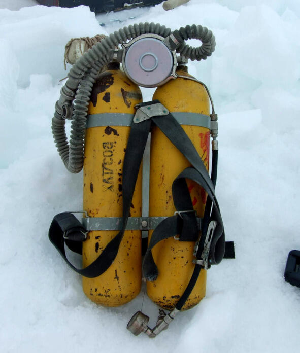 Наше оборудование старое. Такое старое, что даже страшно об этом думать, не только писать. Наши акваланги, только те, кто в этом хоть что-нибудь понимают, пусть не падают в обморок, называются АВМ-1м. Они, разумеется, опрессованны3, проверены и в полном порядке, но их возраст модель 1957 года, а год выпуска 1971. Тем не менее, этот аппарат зарекомендовал себя как надежный, именно в условиях спуска при отрицательных температурах. Проверено лично, можете поверить, его легочный автомат никогда не замерзает до такого состояния, чтобы прекратилась нормальная подача воздуха. У нас был еще и современный, он начал выкидывать фортели сразу, и Джу, который его использовал, вынужден был перейти также на АВМ.