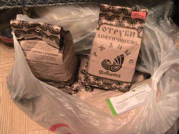 «Да, чуть не забыл самое главное: где продаются отруби. Как правило в СПЕЦИАЛИЗИРОВАННЫХ МАГАЗИНАХ! У нас тут-в маленьком частном магазине, где продаются сухофрукты, сушёные ананасы, клюква в сахаре, орехи, семечки. Я сразу беру их ПОБОЛЬШЕ: ЗАПАС!»