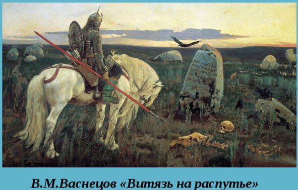 Вопрос выбора жизненного пути русским богатырём на холсте «Витязь на распутье» таит в себе роковой смысл. В каждом предписанном выборе таится манящая приманка-западня. «Правильный» выбор приманки главное условие удачи каждой западни. Точно так же, как русский витязь на картине, и русский народ оказался на распутье в своём историческом развитии. Времени на раздумье не так уж и много. Мрачный фон картины как бы символизирует нависшую над всем человечеством угрозу самоуничтожения, хотя большинство людей этой угрозы не ощущают. Что люди видят на заднем плане картины? Закат, это на картине, или рассвет? Для кого как! Люди, ощущающие рассвет, выбирают духовный путь развития. Люди, предполагающие, что это закат, выбирают антидуховный путь развития. Остальные следуют предписанному3 выбору.