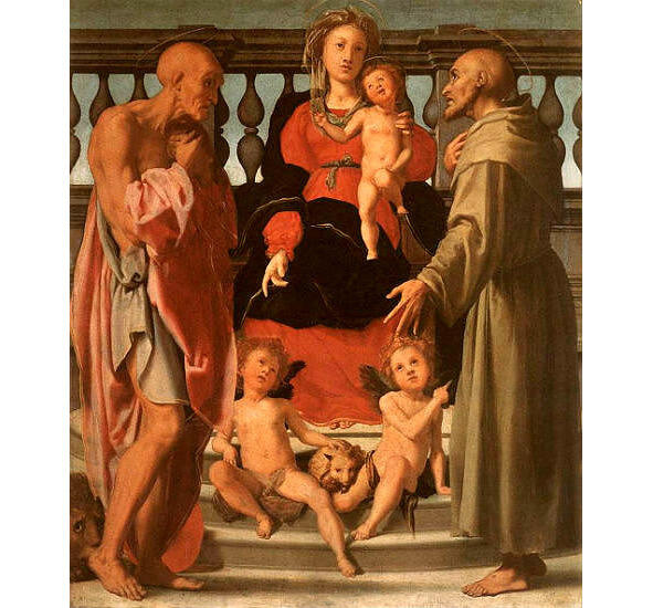 Понтормо. «Мадонна с Младенцем, Св. Иеронимом, Св. Франциском и двумя ангелами». Галерея Уффици. Примерно 1520 г.