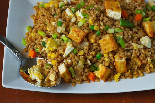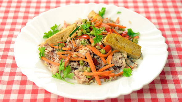 Теплый рис разложить по чашкам, на рис выложить порциями тофу с овощами и подать на стол.