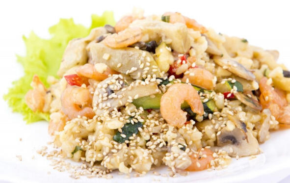 Рис хорошо промыть, откинуть на сито, оставить на 30 минут, затем выложить в кастрюлю, залить подсоленной водой и варить до готовности. Грибы и мясо креветок отдельно нарезать кусочками. На сухой сковороде быстро обжарить креветок, выложить их на тарелку и сбрызнуть вином мирин. На эту же сковороду влить кунжутное масло, обжарить грибы в масле до готовности.