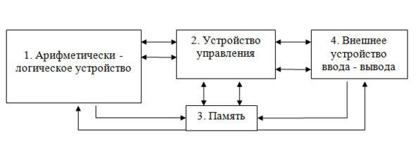 С помощью внешнего устройства в память вводят программу. Устройство управления считывает ее с памяти и ориентирует выполнение по порядку, установленному памятью и выводит информацию на внешнее печатное устройство или экран.