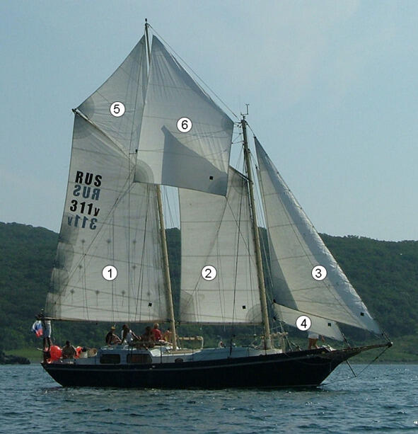 Паруса: 1 грот, 2 фок, 3 кливер, 4 стаксель, 5 топсель, 6 фишерман.