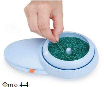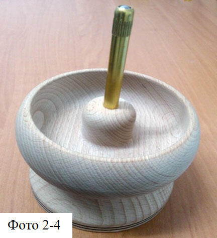 Еще один способ с помощью «прялки» (спинера) для бисера (фото 24, 34) Это приспособление состоит из двух деталей: основания с выступающим из центра металлическим стержнем и деревянной насадки, плотно прилегающей к основанию. Как пользоваться. Высыпаем бисер в чашечку так, чтобы было чуть больше половины, иначе бисер будет выпадать во время вращения «прялки». Опускаете кончик длинной проволоки в чашу, держите ее наклонно. Другой рукой вращаете «прялку» так, чтобы она крутилась на проволоку. И бисер сам будет нанизываться на проволоку.