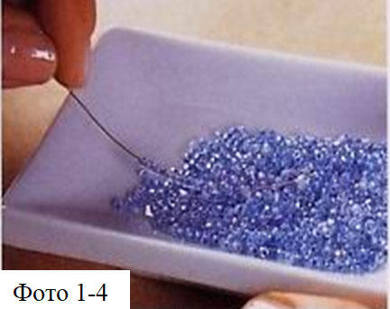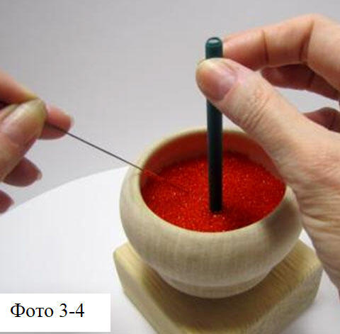 Нанизывание бисера на проволоку можно проводить тремя способами. Самый простой, но самый трудоемкий способ это нанизывание вручную по одной бисеринке. Насыпьте бисер в маленькую емкость и концом проволоки подхватывайте бисеринки, нанизывая их на проволоку (фото 14).