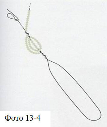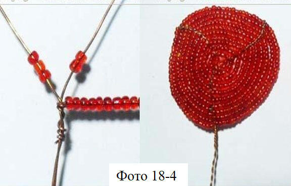 Для получения лепестков цветка или листа большой ширины применяют плетение на нескольких осях (фото 184). Скручиваем два отрезка проволоки примерно в середине длины и прикрепляем к ним низку бисера.