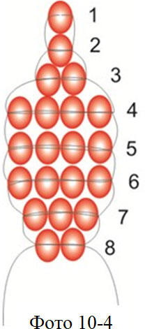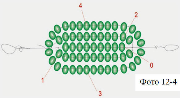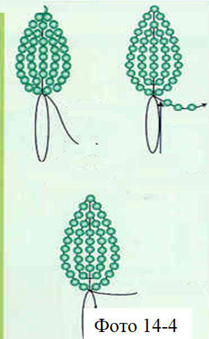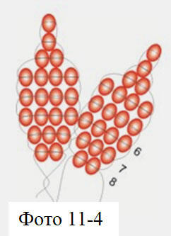 Ряд 4. Нанизываем на правую часть проволоки 4 бисерины и вторую часть проволоки протягиваем через весь ряд. Отцентрируем четвертый ряд относительно третьего. Ряды 5 и 6 выполняем также как и 4 ряд.