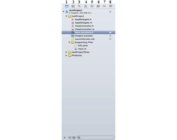 Рассмотри навигацию проекта (рис. 1.10). Первая вкладка файловый инспектор проекта. Вторая показывает нам классы, а при их раскрытие, показывает методы классов. Третья поисковая строка, ищет во всем проекте, также можно искать и в самом классе (cmd+f). Четвертая показывает список предупреждений и ошибок, если таковые имеются. Пятая список существующих тестов для приложения. Шестая вкладка показывает нагрузку на процессор, память, сеть, файловую систему телефона. Седьмая список точек остановок. Восьмая показывается выполненные действия над проектом.