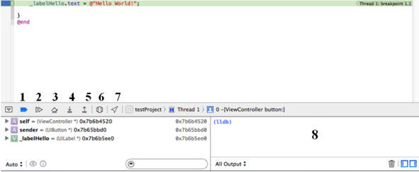 Первая кнопка отключает/включает точки остановки. Вторая продолжить/приостановить процесс работы приложения. Третья пошаговая отладка кода. Четвертая кнопка заход в метод. Пятая выход из метода. Шестая позволяет нам просматривать наше приложение в виде 3D-модели. Седьмая кнопка задает местонахождение. Окно под номером 8 консоль, в которой выводятся системные сообщения.