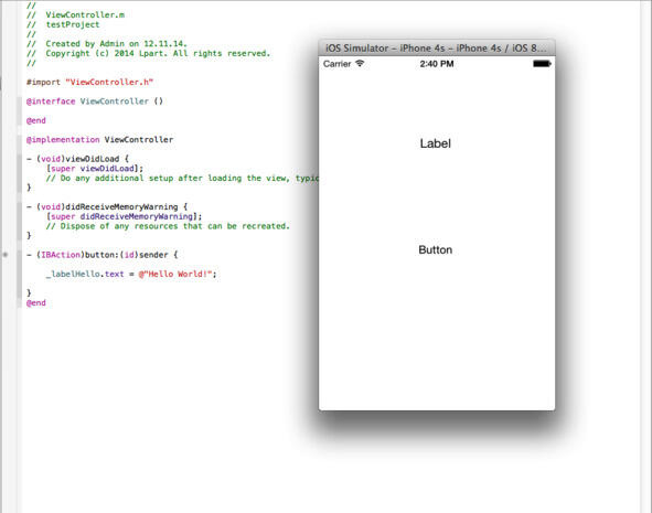 Затем, с помощью метода «drag and drop», добавляем на наш View Controller. Затем таким же способом добавим Label. Обоям объектам установить размер 200х40, в инспекторе размера. А нашему вью в инспекторе параметров, установите для size значение iPhone 3.5 inch.
