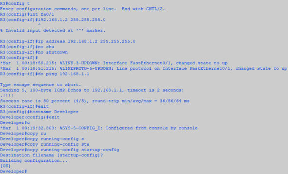 Рисунок 28 Настройка интерфейсов маршрутизатора Developer, проверка соединения с соседний маршрутизатором, изменение имени устройства и сохранение текущей конфигурации в энергонезависимой памяти