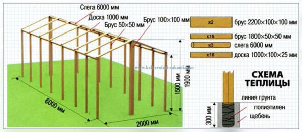 Рисунок выше показывает не только схему теплицы, но и перечень материалов, необходимых для ее строительства, а также их размеры и расход. Перечень этот предназначен для стандартных размеров 6х2.8 м., однако исходя из этих данных можно высчитать количество нужного материала под свой размер.