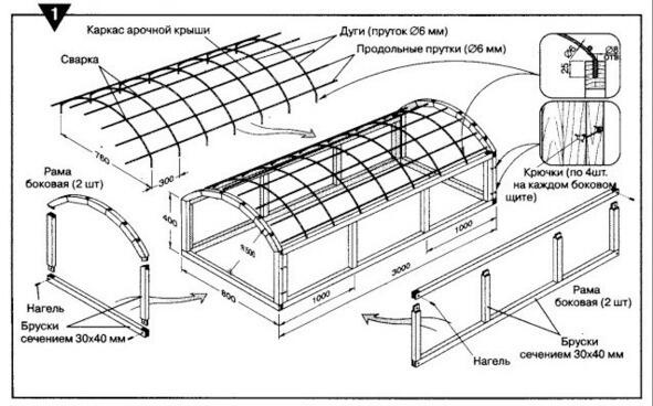 Если для покрытия теплицы вы используете поликарбонат, то количество секций будет зависеть ширины этого покрытия (210 см.). Секции при этом, например, можно расположить на расстоянии 0,51 м друг от друга. Размеры же самих секций будут такими: 1,51,6 м для боковых стенок, 3-метровые брусья для соединения верхней части и бруски по 1,75 м для скатов крыши. Впрочем вы можете подобрать размеры самостоятельно.