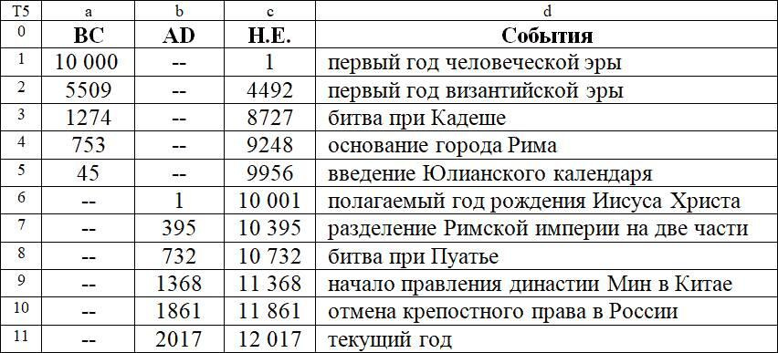 1.21. В 1993 AD итальянский геолог Чезаре Эмилиани предложил ввести голоценский календарь и перейти к использованию человеческой эры (Cesare Emiliani «Calendar Reform», Nature, 366, 30 December 1993. P. 716). Эта эра сокращенно пишется как H. E., так как образована от английских слов Human Era. Предложение Ч. Эмилиани заключалось в том, чтобы начать отсчёт H. E. за 10 000 лет до христианской эры, что примерно соответствует началу эпохи Голоцена в геологии. Тогда год рождения Иисуса Христа приходился бы уже не на 1 AD, а на 10 001 H. E. Чтобы перевести любой год в период от 1000 до 2017 AD в H. E., нужно всего лишь поставить единицу перед этим годом. Например, 2005 AD соответствует 12 005 H. E.